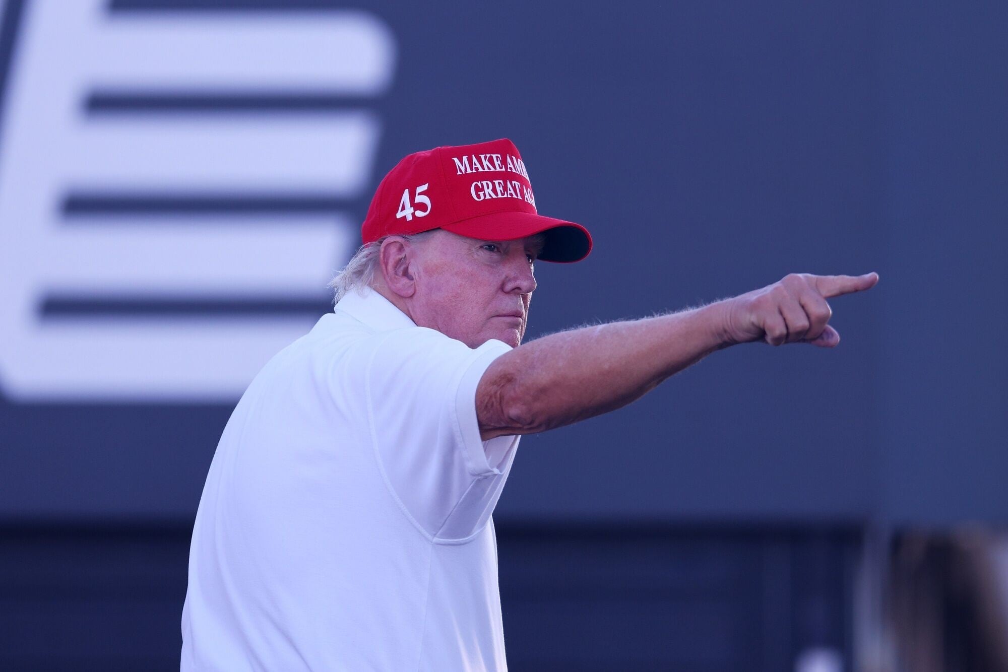 BEDMINSTER, NEW JERSEY - AUGUST 13: Former President Donald Trump waves to the crowd on the 16th tee during day three of the LIV Golf Invitational - Bedminster at Trump National Golf Club on August 13, 2023 in Bedminster, New Jersey. (Photo by Mike Stobe/Getty Images)
