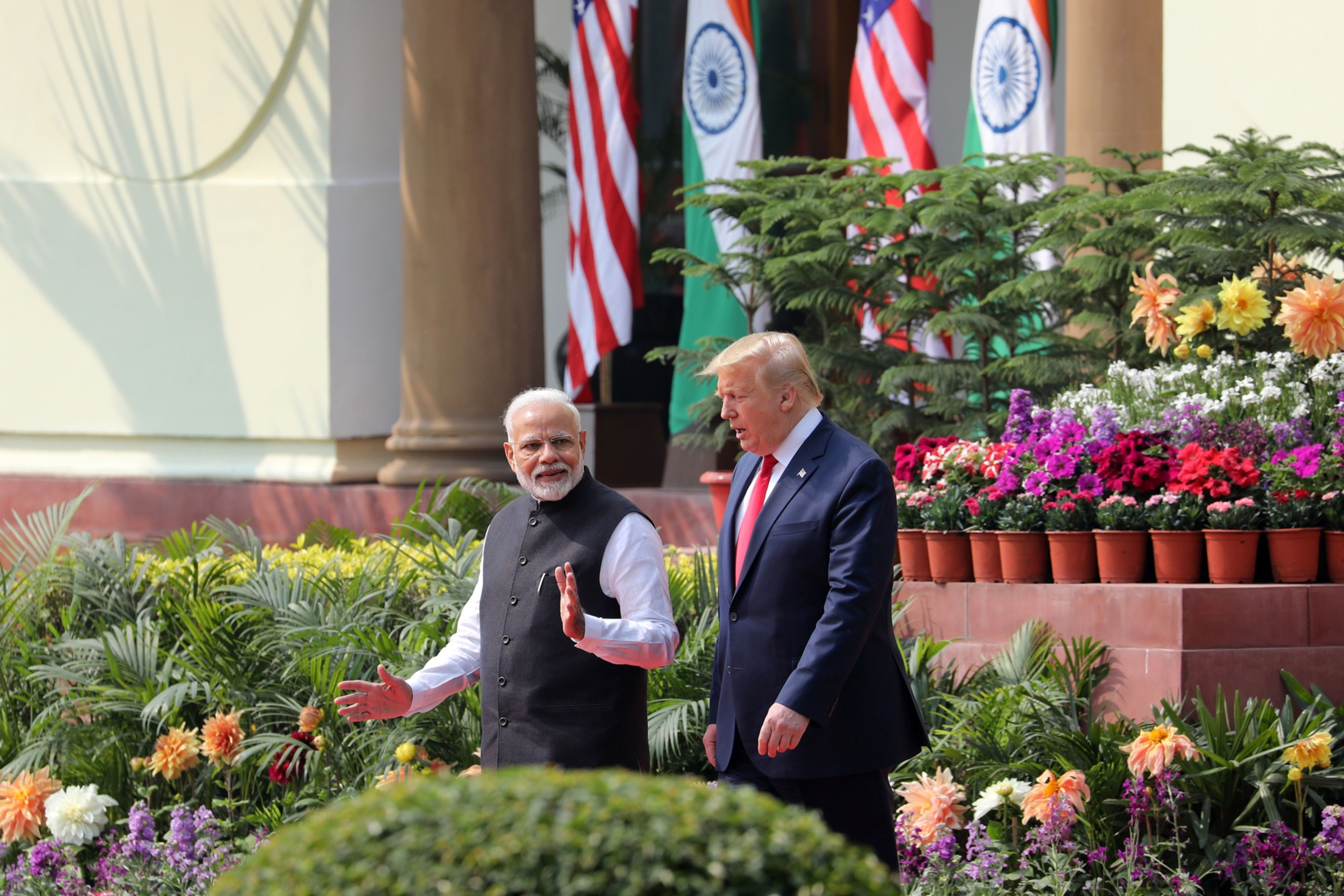 Narendra Modi, India’s prime minister, left, and U.S President Donald Trump, arrive for a news conference at Hyderabad House in New Delhi. (Photographer: T. Narayan/Bloomberg)