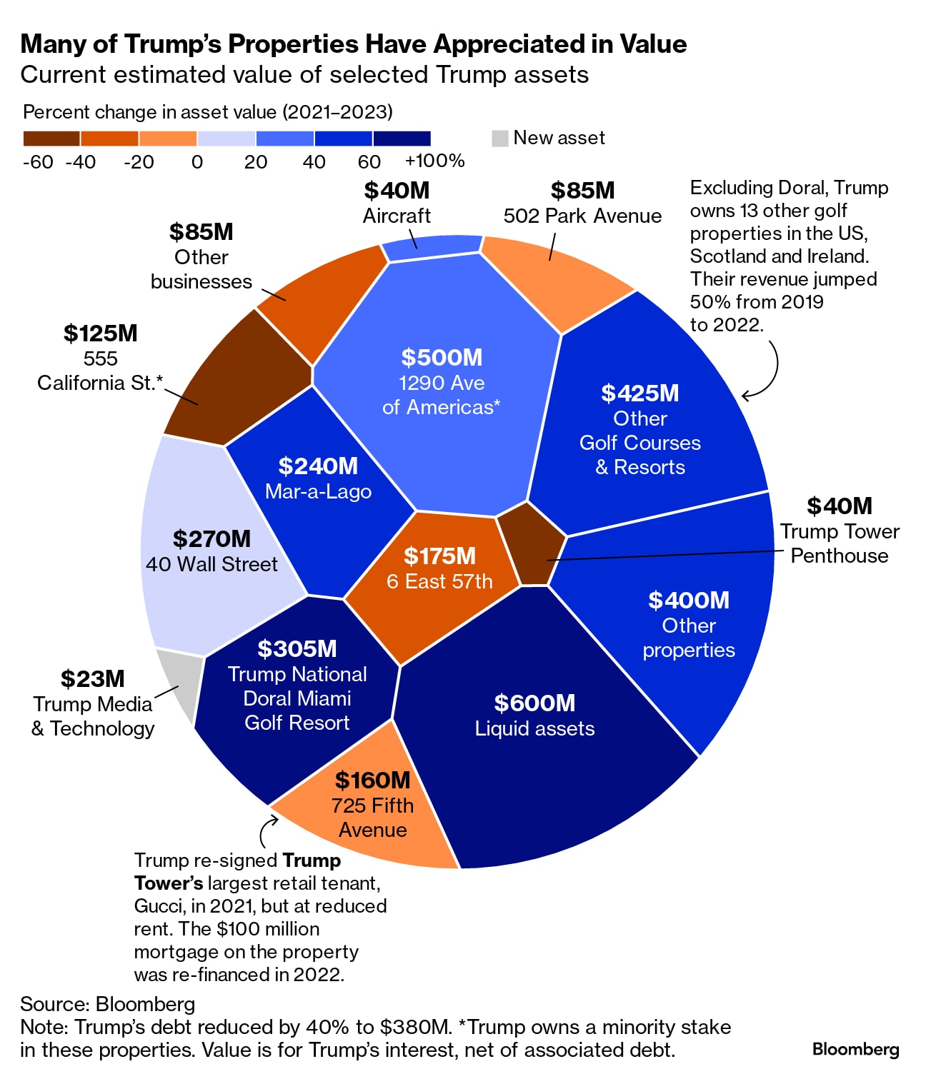 Trump has a net worth of $3.1 billion according to the Bloomberg Billionaires Index, the most cash and least leverage than at any point in the past decade. Most of his fortune is tied up in real estate, including office and residential buildings in Manhattan, several golf courses and the famous Mar-a-Lago Club in Palm Beach, Florida.