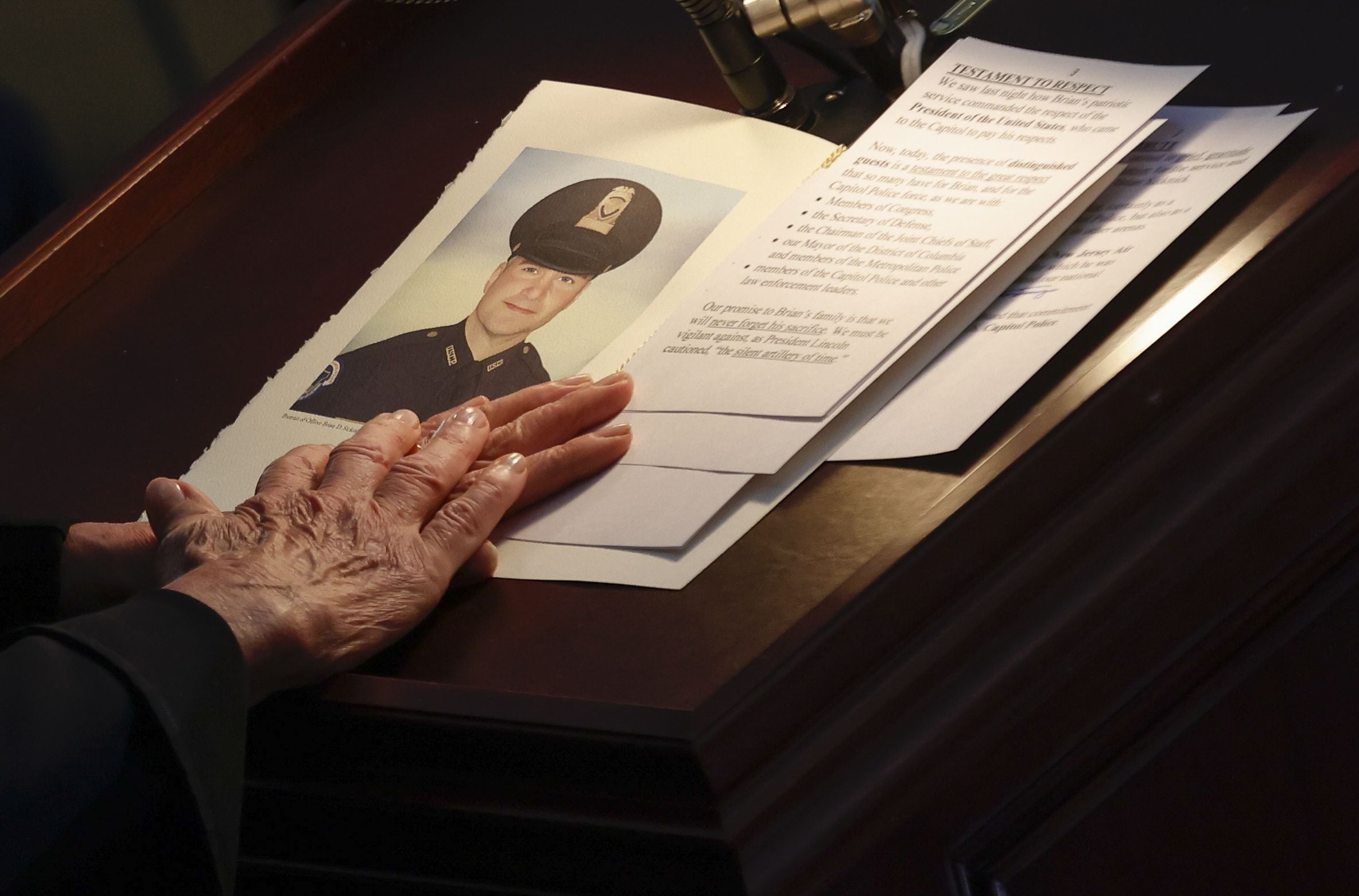A portrait of late Brian Sicknick as he lies in honor during a ceremony in the Rotunda of the US Capitol building on Feb. 3, 2021. Photographer: Carlos Barria/Getty Images