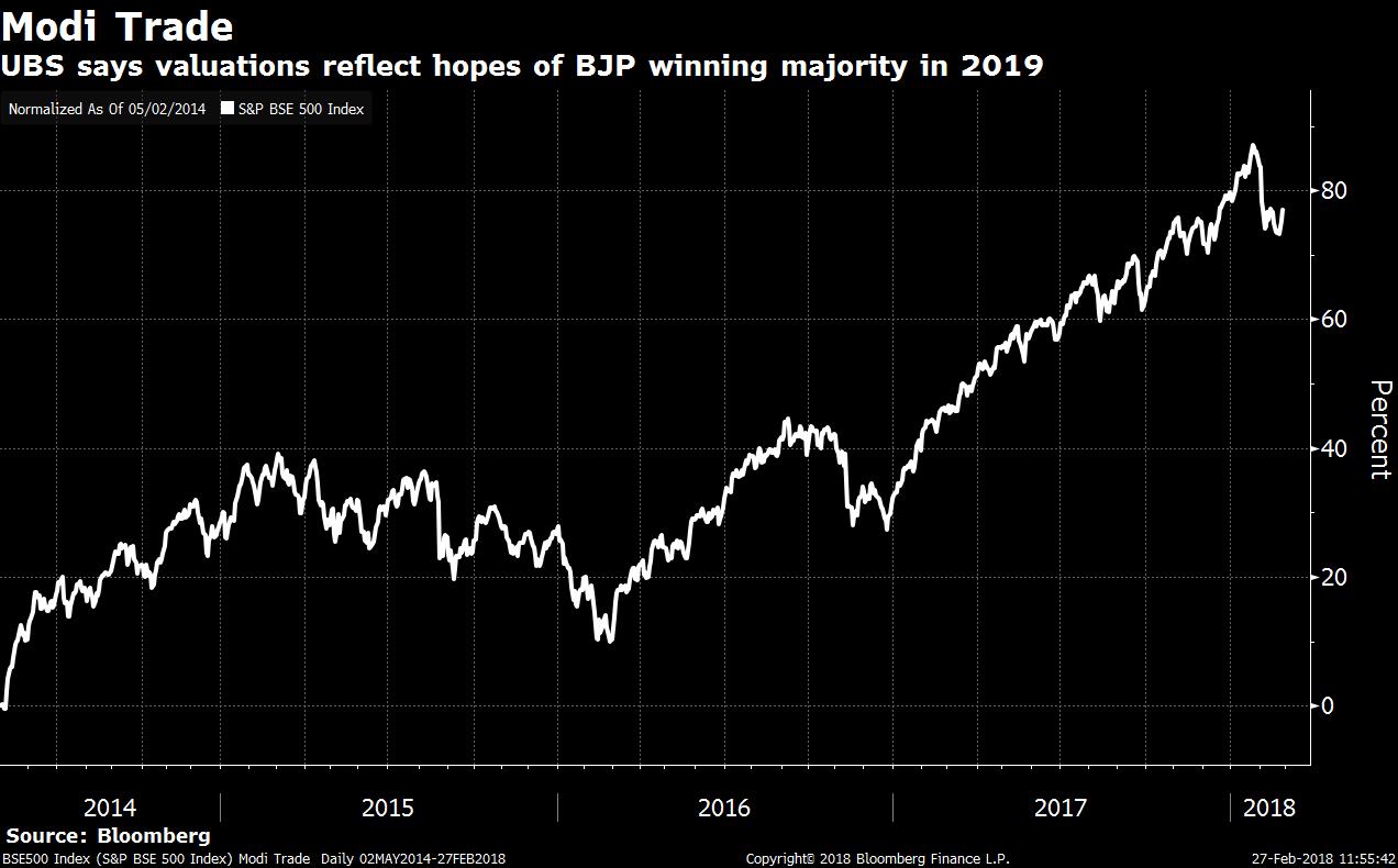 UBS Securities India Pvt. says the optimism about the government's economic agenda has helped investors brush off weak earnings. And the expensive equity valuations underpin the market's hopes for Modi returning with a single-party majority, analysts led by Gautam Chhaochharia wrote in a note dated Feb. 23.