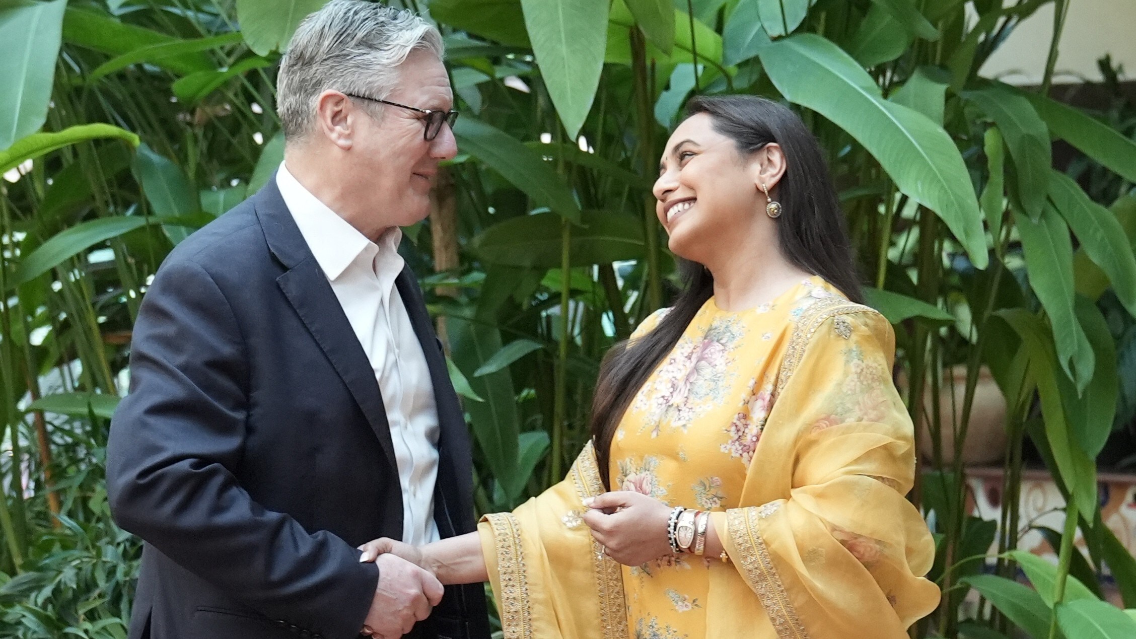 Yash Raj Films CEO Akshaye Widhani, UK Prime Minister Keir Starmer and actor Rani Mukerji watch a screening during the PM's visit to Yash Raj Films in Mumbai.