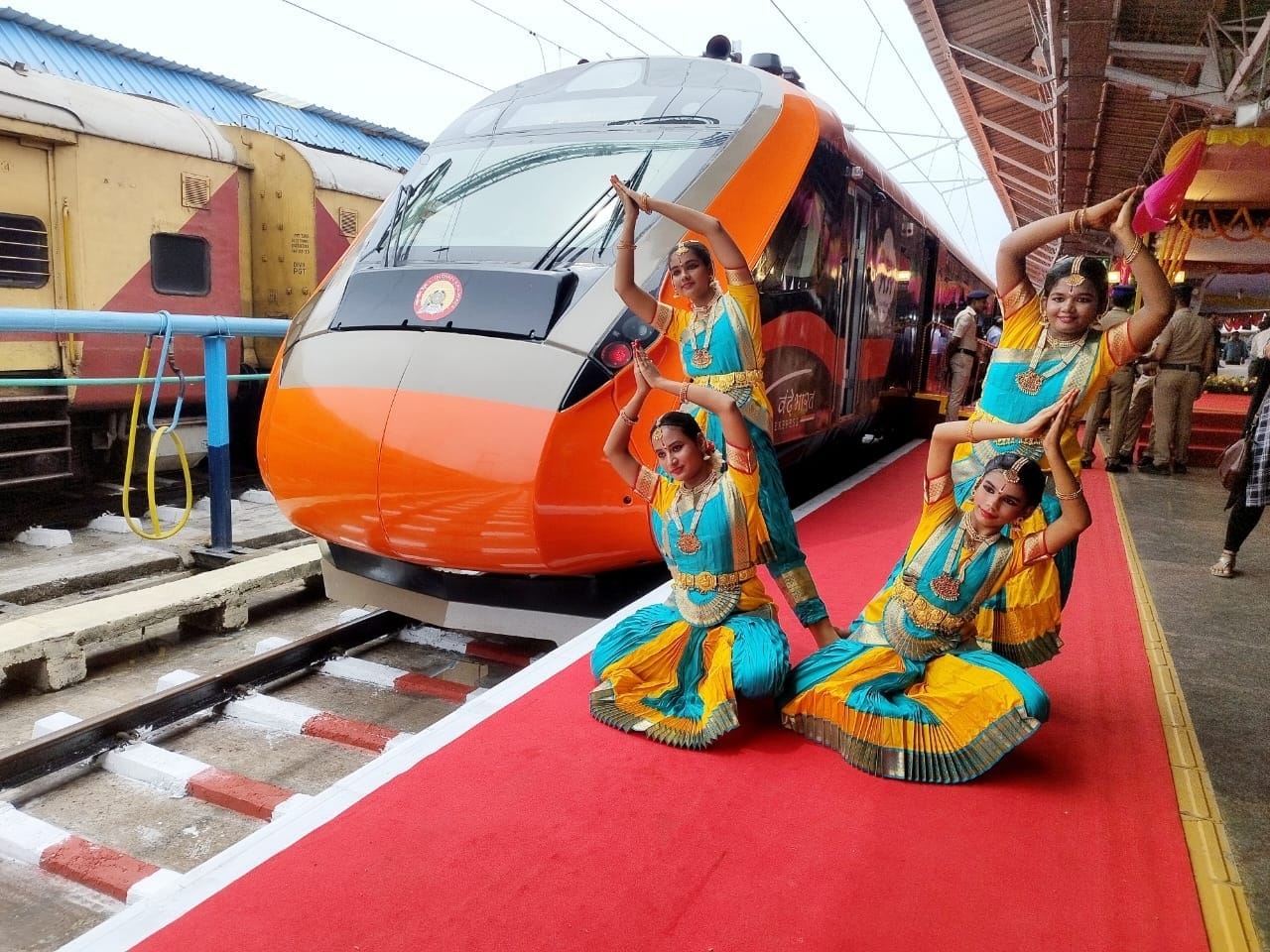 Bharatanatyam dancers pose before the Chennai Central-Nagercoil Vande Bharat Express at its launch event on Saturday. (Source: X/@GMSRailway)