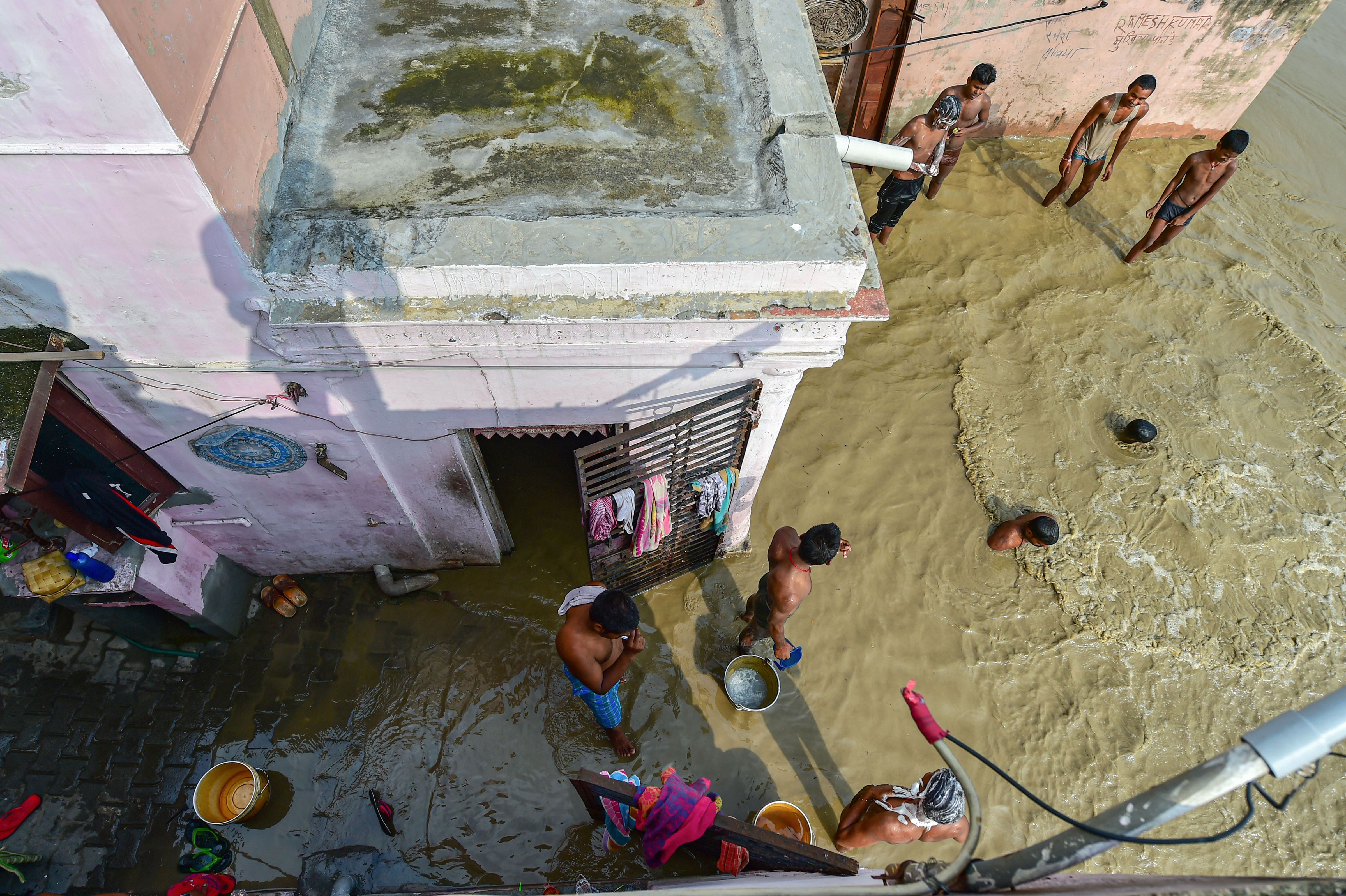 Yamuna river floods a locality along its banks, following the release of water from the Hathinikund Barrage, in New Delhi. (Source: PTI)