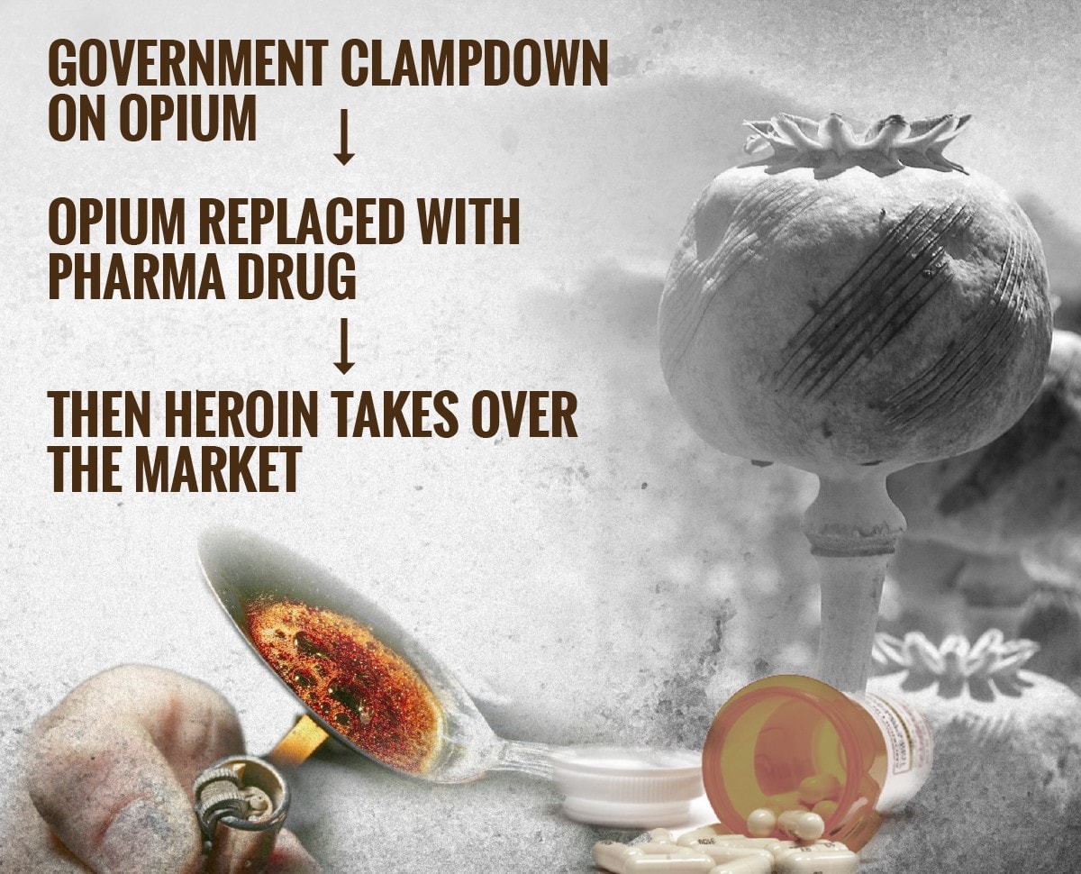 Heroin is at least three times more potent than opium. A senior drug specialist at AIIMS said that studies have shown that more than 90 percent opium users do not suffer from addiction issues, making it the lesser of the two evils.