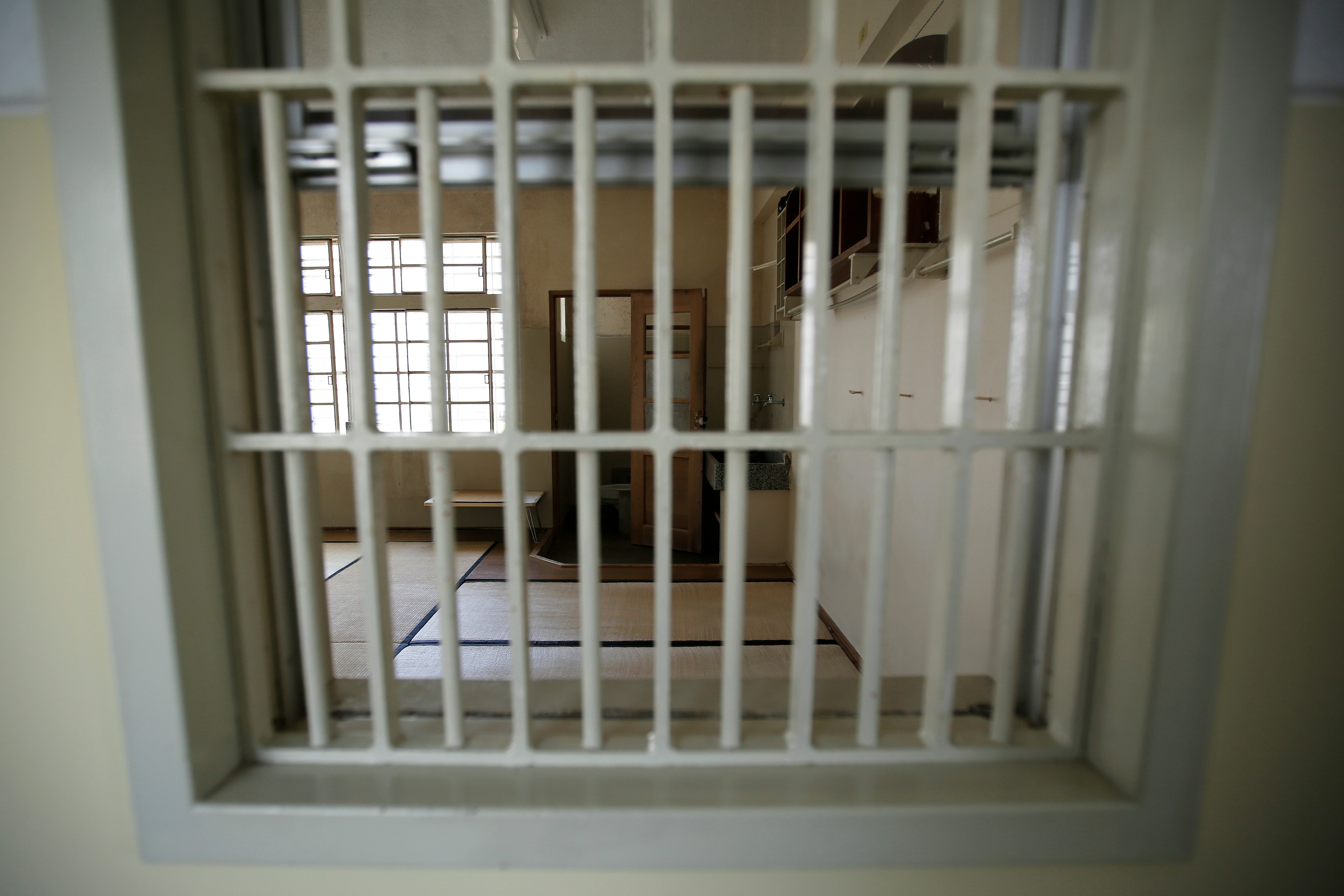 A shared jail cell is seen through a barred window. (Photographer: Kiyoshi Ota/Bloomberg)