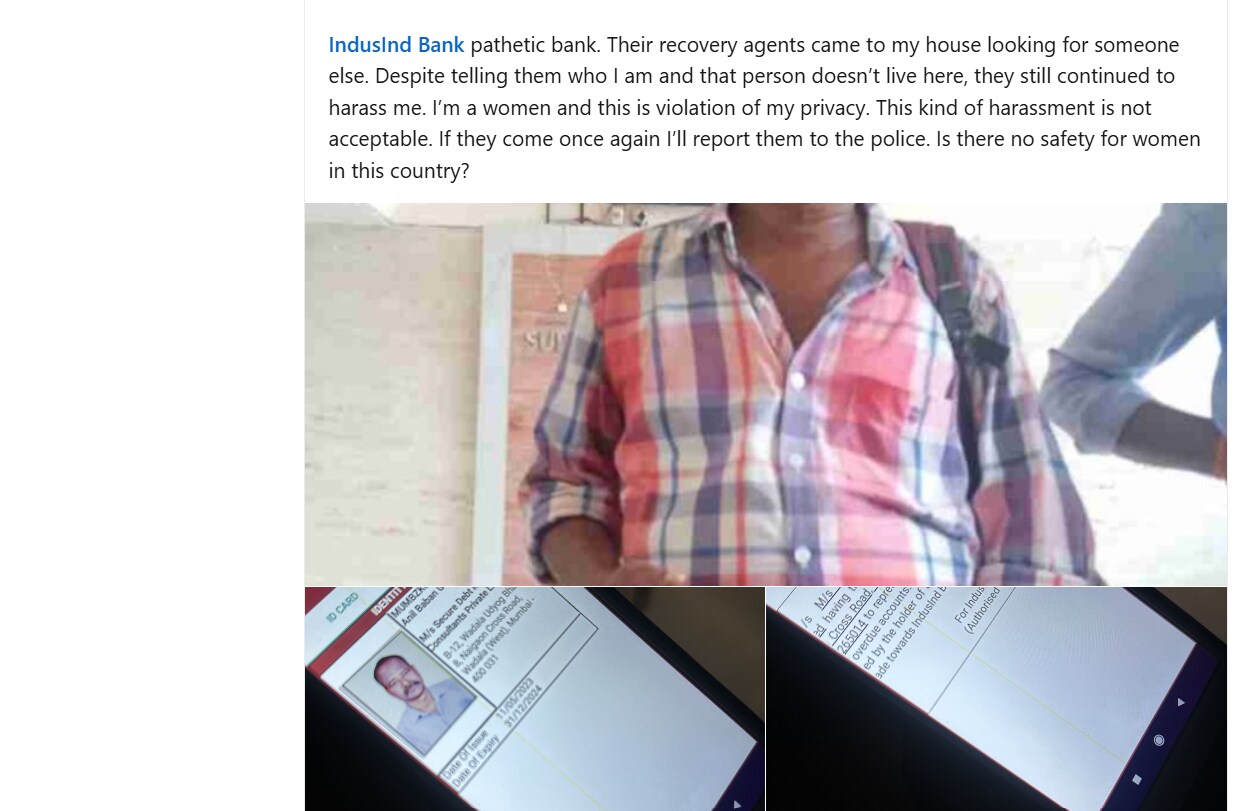 A woman took to LinkedIn to accuse recovery agents of IndusInd Bank of harassing her and violating her privacy, despite her clarification that she was not the person they were looking for.