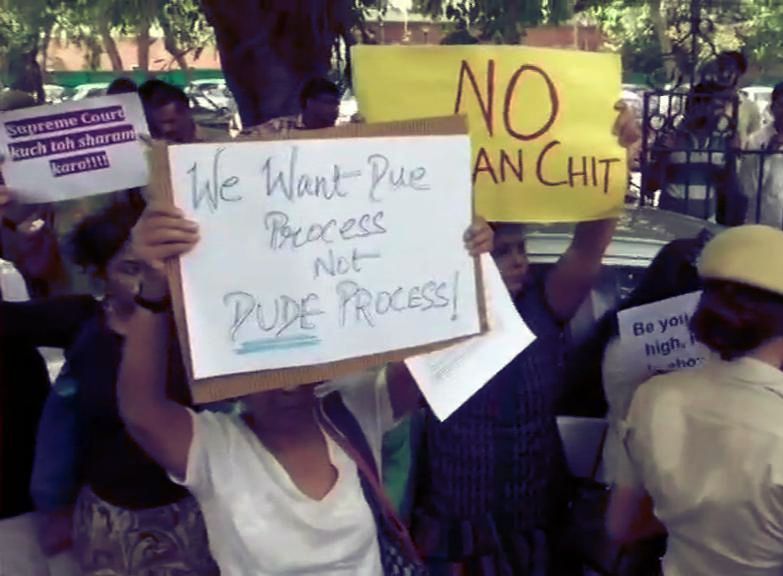 Carrying banners—which read “No clean chit”, “Supremacy of Rule of law must be maintained”, “Be you ever so high, the law is above you”—several women lawyers and activists staged a protest outside the Supreme Court raising objection to the clean chit given to Gogoi.