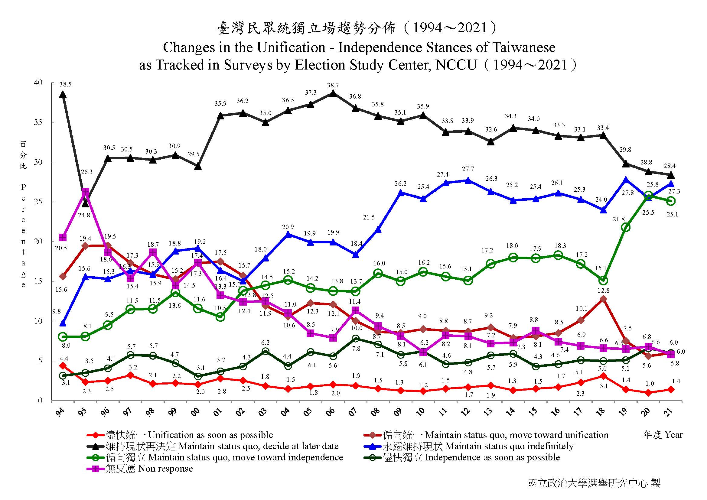 There is little support in Taiwan for a political union with China, according to the Election Study Center at Taipei's National Chengchi University. Since 1997, the percentage of the population that backs formal independence has doubled to more than 30%, while support for unification has more than halved to single digits.
