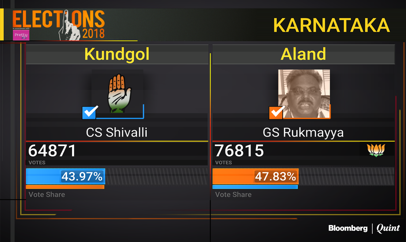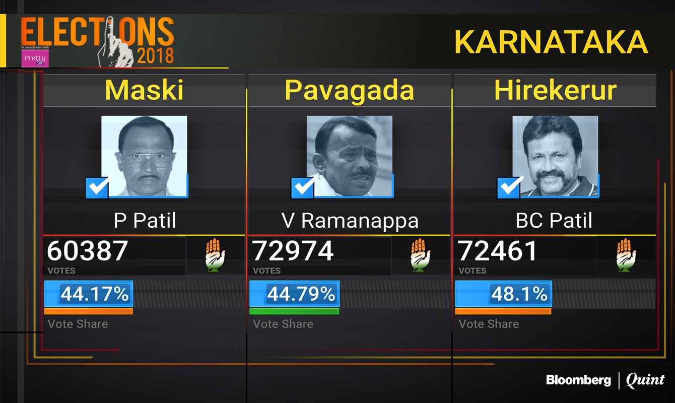 BC Patil of the Congress won Hirekerur, Belagavi by 555 votes and his party colleague CS Shivalli won Kundgol, Belagavi by 634 votes. BJP's GS Rukmayya of Aland, Kalaburagi scraped through by a 697 vote margin.