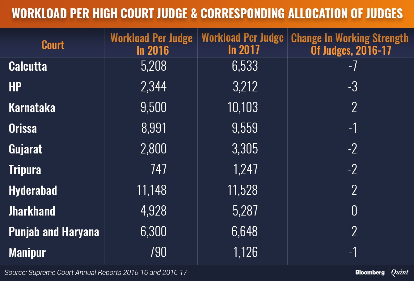 In 2016, although Bombay had a lower workload per judge than Calcutta, Bombay saw an increase of 10 judges while Calcutta saw a decline of seven judges.