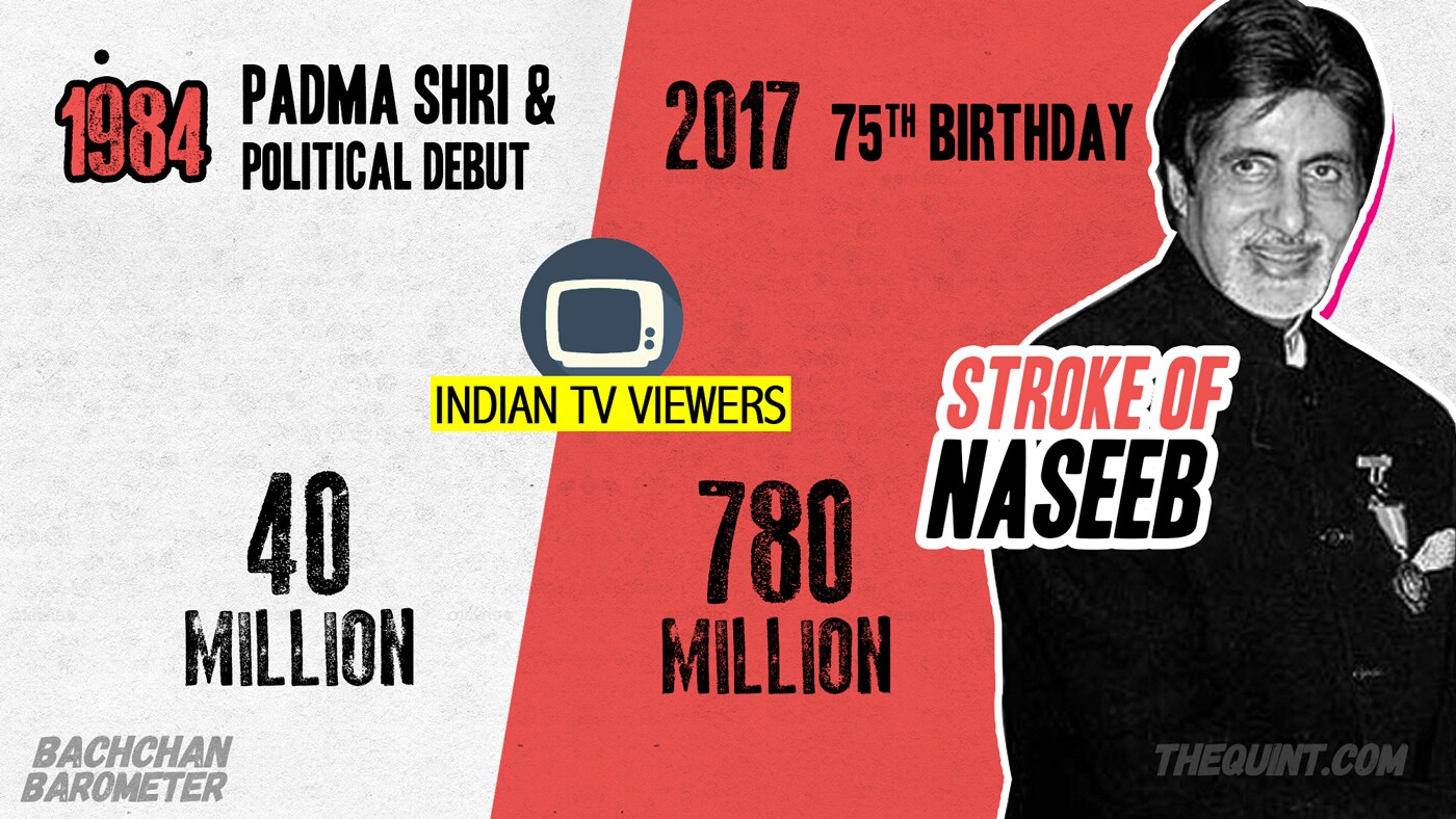 1984 was a major milestone for Amitabh Bachchan. Buoyed by the rise in TV viewers, Bachchan's popularity too continued to rise. He was awarded a Padma Shri, and made a successful (though short-lived) foray into politics too.