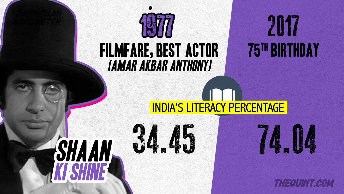 Bachchan senior got his first Filmfare award for Best Actor in 1977, for Amar Akbar Anthony. Films continue to be a great source of entertainment, because they cut across the population's class divides. You could enjoy a masala movie even if you were illiterate, and India suffered from illiteracy back then. Only 34.45% population was literate in 1977.
