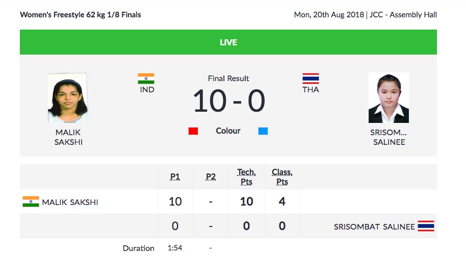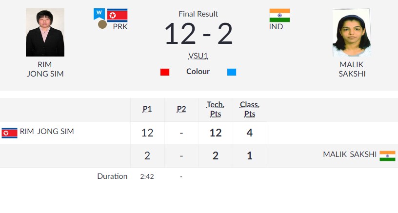 Sakshi was never in the match as her North Korean opponent took a 6-0 lead in first two minutes. Eventually Sakshi lost on technical superiority after playing for 2:42 minutes.