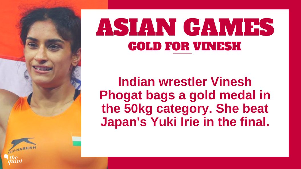 History made! Vinesh Phogat has became the first Indian woman wrestler to win an Asian Games gold with her victory over Japan's Yuki Irie in the 50 kilogram women's Freestyle category.