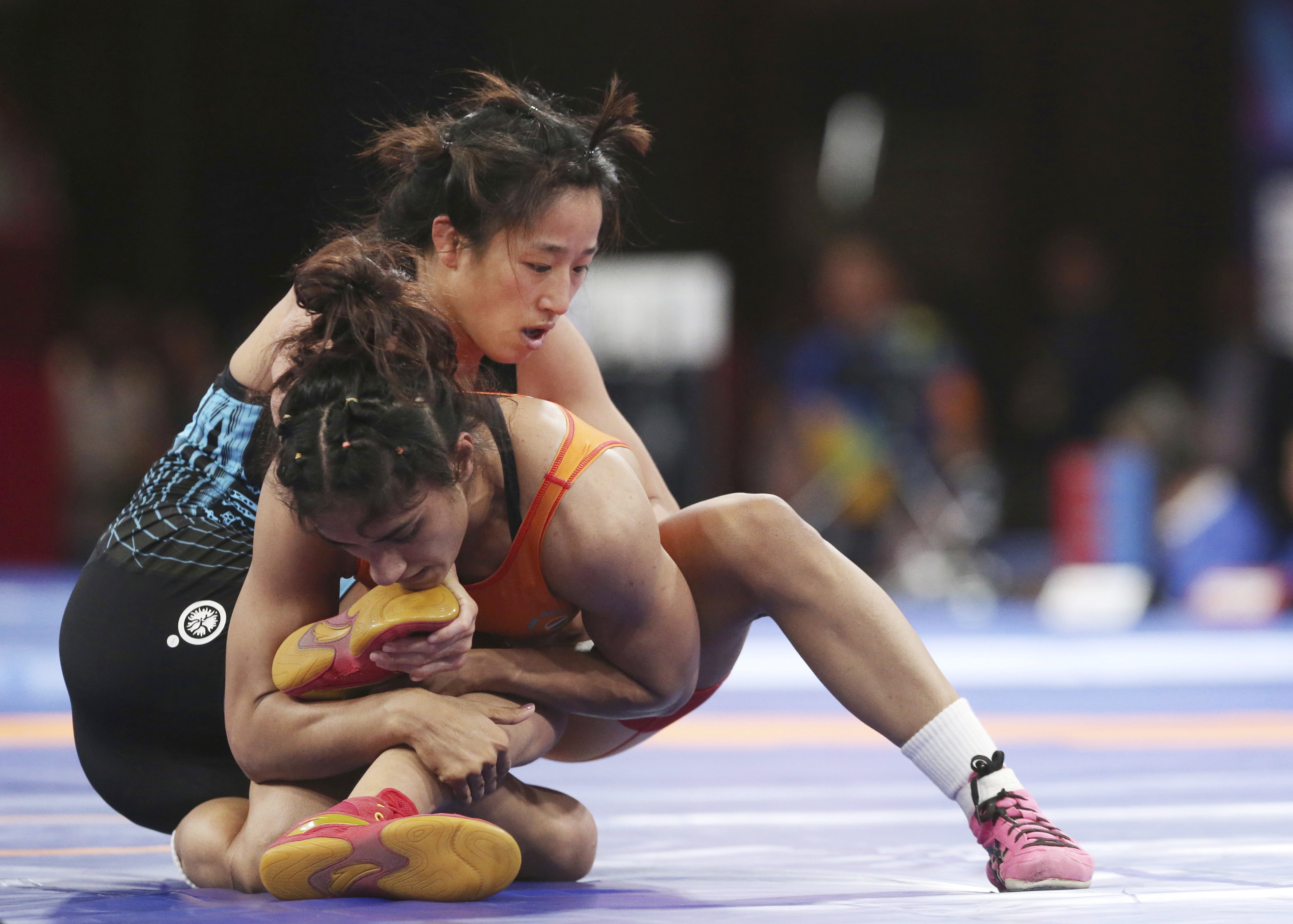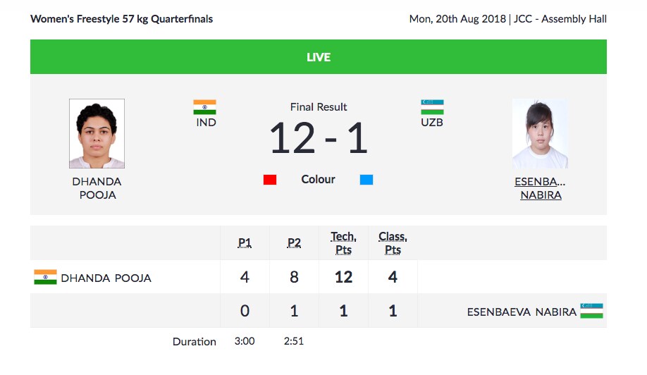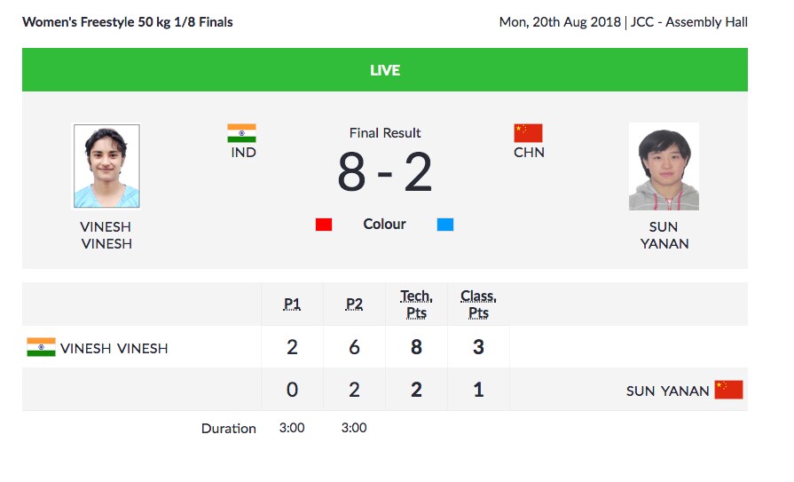 After Period 1, the Indian had a dominant 6-0 lead and with 90 seconds to go in the bout, the Korean made a play that backfired as Vinesh had her on her back. The four points from the move meant Vinesh won the bout by technical superiority. Kim asked for a review on a move which was overruled and extra point was added in Vinesh's tally.