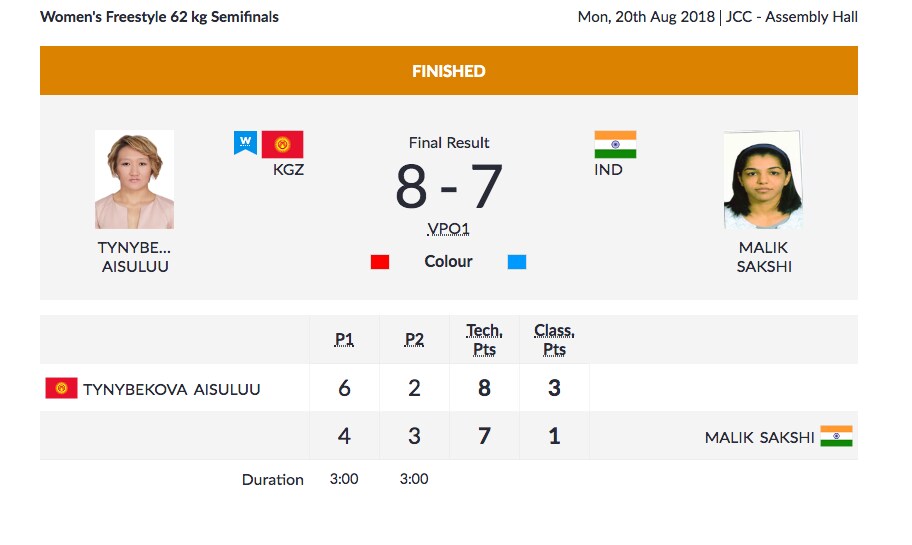 Olympic bronze medallist Sakhi Malik has lost her semi-final 8-7 to Aisuluu Tynybekova of Kyrgyzstan. She held a 7-6 lead till the last 10 seconds when her opponent pushed her on the mat, picking up two points.