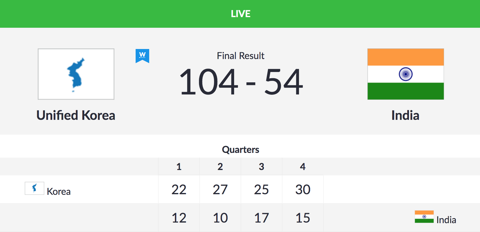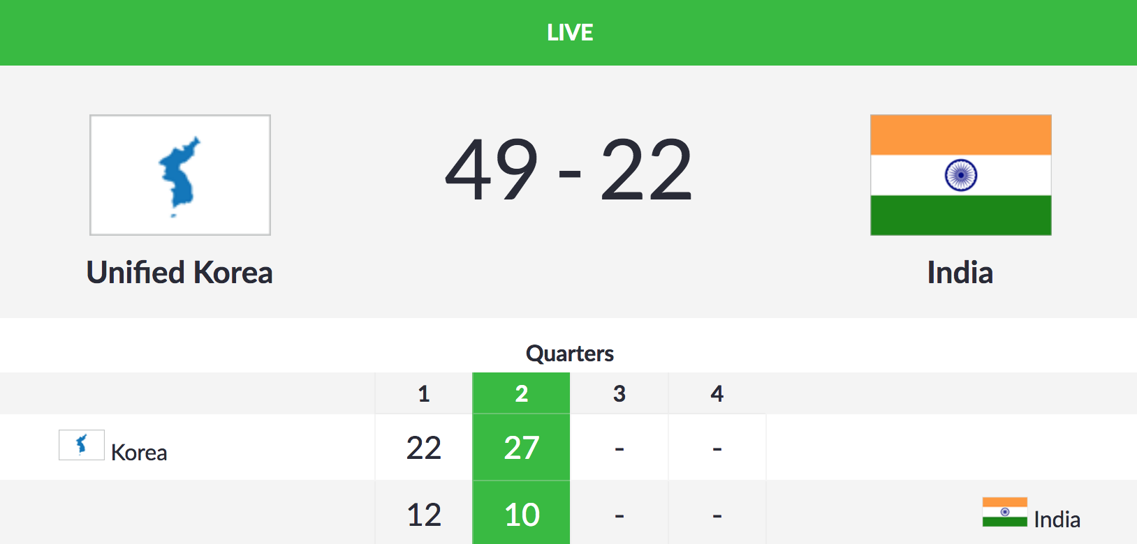 The Indian women's basketball team are trailing 22-49 against Unified Korea after the first two quarters in their third women's basketball Group A match.