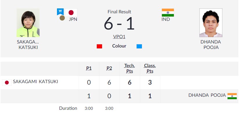 Pooja Dhanda lose 1-6 to Japan's Katsuki Sakagami in the bronze medal match in the women's 57 kg category.
