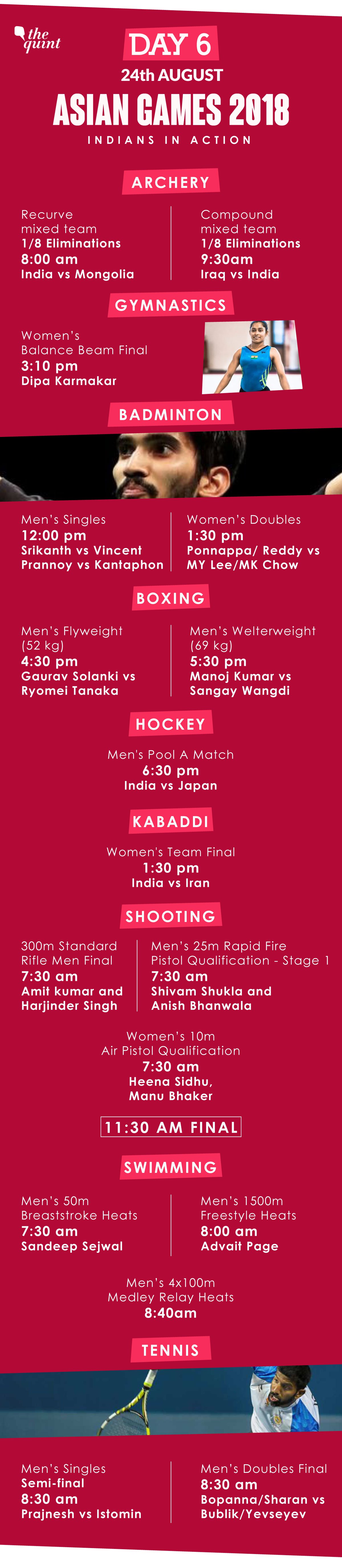 It is going to be an action packed Friday, 24 August for the Indian contingent on Day 6 of the 18th Asian Games in Indonesia. Having already won 18 medals at the Games, India would look forward to win a few more medals.