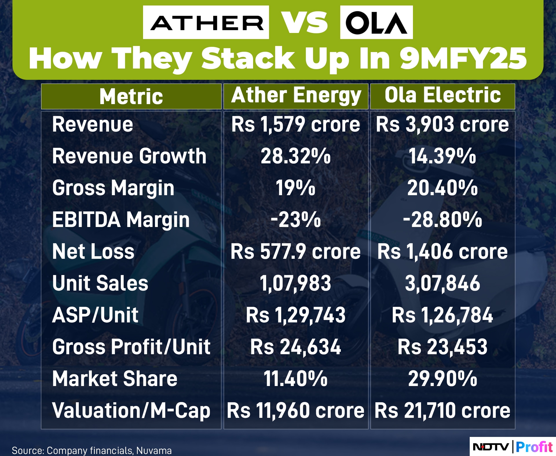 The Battle of the Bengaluru Boys: Ather Energy Ltd. has doubled its adjusted gross margin and reduced loss since the Bengaluru-based EV maker first filed its IPO papers, so much so that its financials are now comparable to those of crosstown rival and India's former No. 1 electric two-wheeler maker Ola Electric Mobility Ltd.
