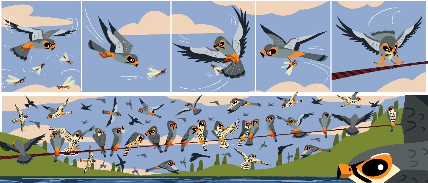 Expert hunters on the wing, Amur Falcons take smaller prey, mostly insects and small birds. After the brief stopover, they traverse the Arabian Sea all the way to the African coast.