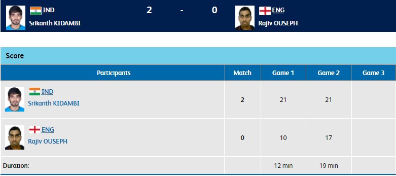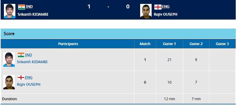 In the men's singles, World No. 1 Kidambi Srikanth takes on Rajiv Ouseph of England in the semi-finals. Srikanth takes the first game 21-10 to go up 1-0.