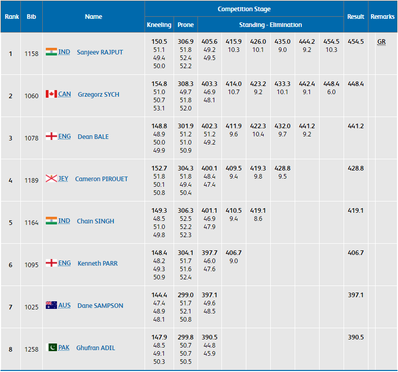 India's Sanjeev Rajput and Chain Singh trail Grzegorz Sych of Canada after shooting 306.9 and 306.3 respectively after kneeling and prone variants.