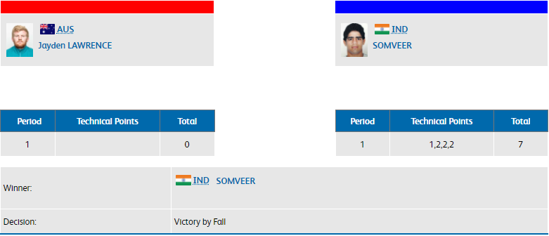 India's Somveer beat Jayden Lawrence of Australia in the second round of men's freestyle 86 kg repechage. Somveer won 7-0 by the virtue of victory by fall.