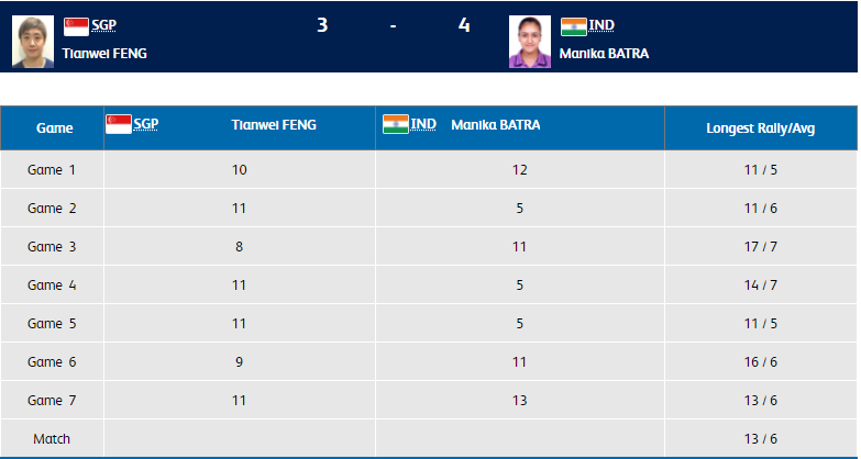 Manika Batra leads 3-0 in the women's singles gold medal match against Singapore's Mengyu Yu. Batra wins the third game 11-2. She is just one win away from a gold medal.