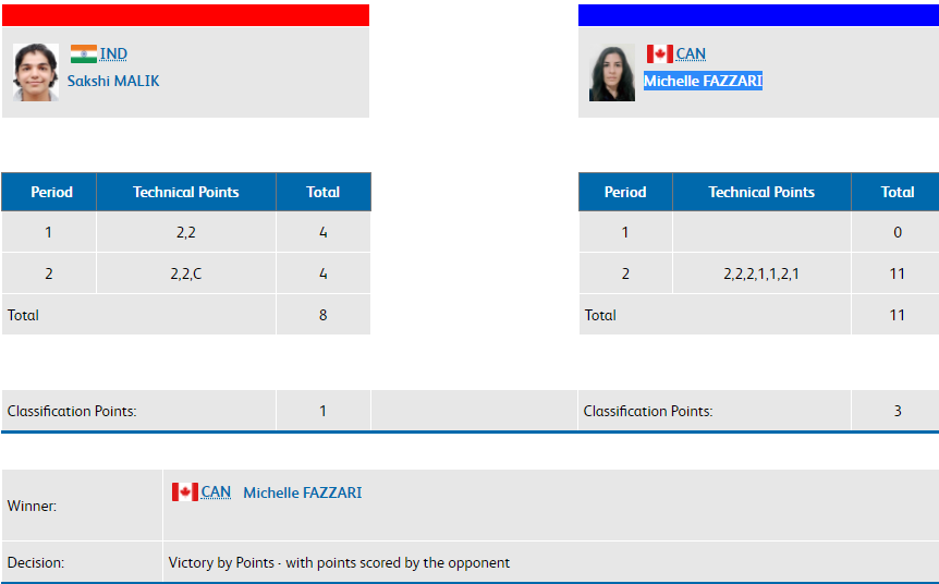 In the women's 62 kg weight class event, Sakshi Malik lost her second bout against Canada's Michelle Fazzari 8-11.