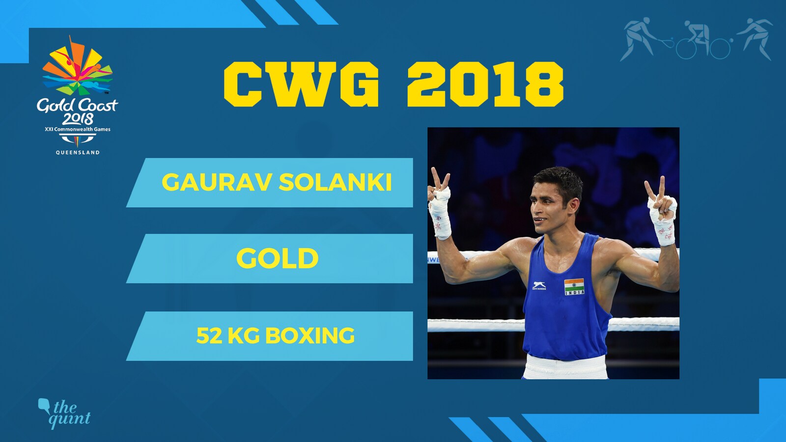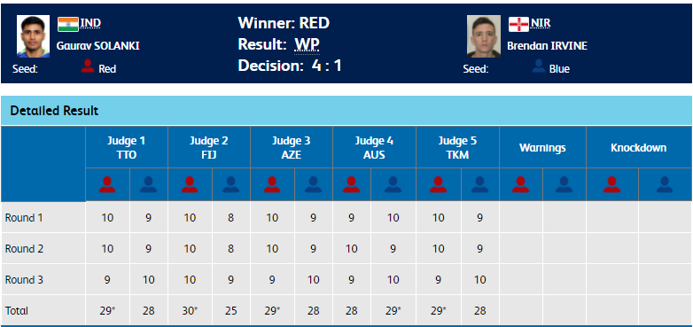 Gaurav Solanki wins India's second gold in boxing. He defeats Englishman Brendan Irvine 4-1. In an evenly fought match, Gaurav managed to score higher by a slender margin.