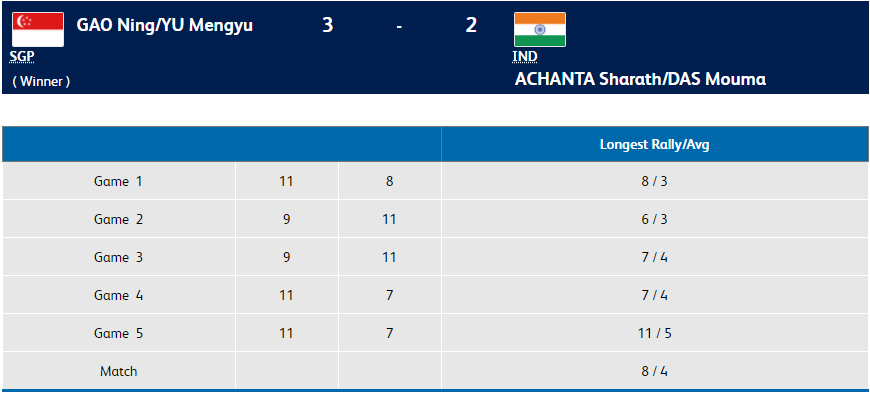 Duo of Sharath Achanta/Mouma Das lose against Ning Gao /Yu Mengyu from Singapore in the mixed doubles semi-finals. The Indian pair will now play the bronze medal match on Sunday. Sharath Achanta/Mouma Das lost 8-11, 11-9, 11-9, 7-11, 7-11.
