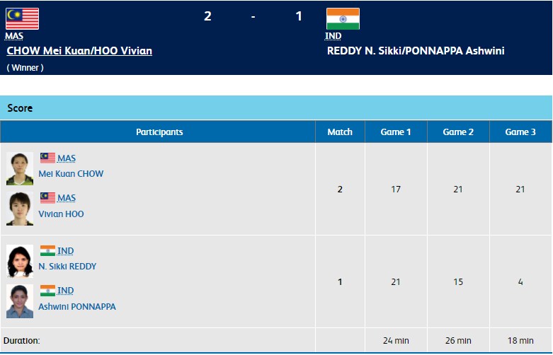 Ashwini Ponnappa and Sikki Reddy end their campaign in the semis to Malaysia's Mei Kuan Chow and Vivian Hoo. The Indian duo won the first game 21-17 and went on to lose the next two games 15-21 and 4-21.