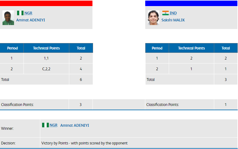 Rio Olympics bronze medallist Sakshi Malik stunned by Aminat Adeniyi of Nigeria. Sakshi lost 3-6. Despite her loss, she still gets one classification point.