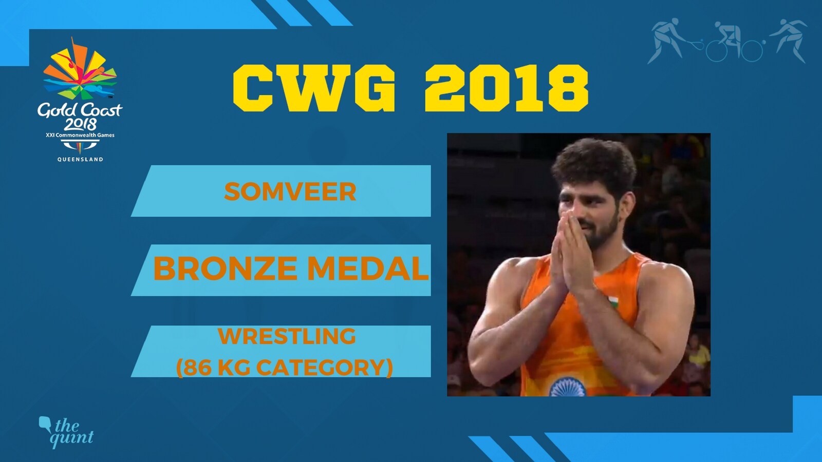In the men's freestyle 86 kg weight category event, Somveer wins his quarterfinal bout against Kiribati's Taebontangaroa Kookoo 4-0. He won the bout by the virtue of victory by fall.