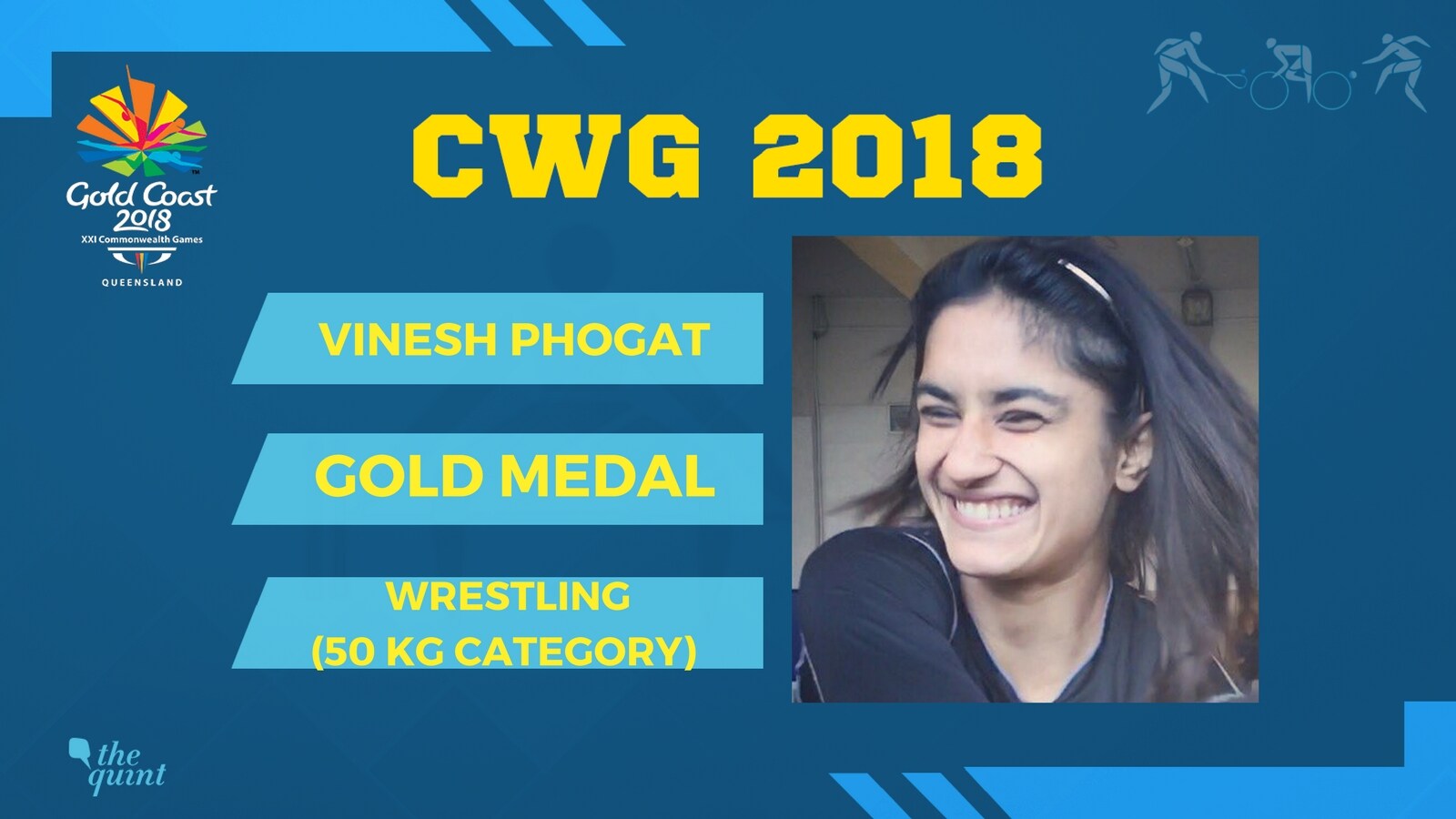 Vinesh Phogat (50 kg) bags gold after beating Canada's Jessica MacDonald by technical superiority. Phogat wrapped up the gold medal match with a scoreline of 13-3.