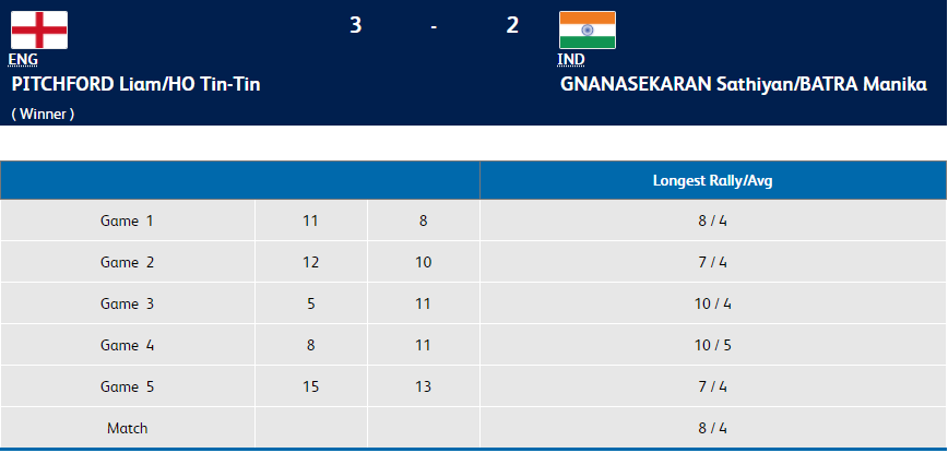 Sathiyan and Manika lost 8-11, 10-12, 11-5, 11-8, 13-15.