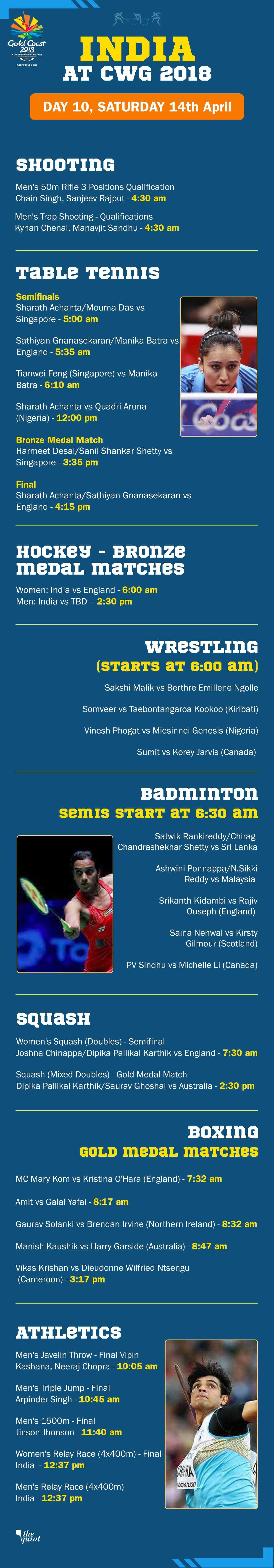 Badminton semi-finals are also on Saturday with Satwik Rankireddy/Chirag Shetty facing Sachin Dias/Buwaneka Goonethilleka of Sri Lanka. Kidambi Srikanth is playing Rajiv Ouseph of England, HS Prannoy has a tough one against Malaysia' Lee Chong Wei, Saina Nehwal plays Scotland's Kirsty Gilmour and PV Sindhu takes on Canada's Li Michelle.