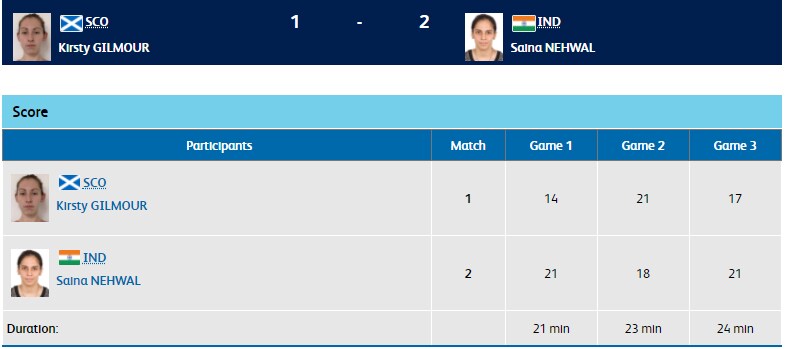 World No. 10 Saina Nehwal beats Kirsty Gilmour of Scotland 21-14, 18-21, 21-17 to advance into the women's singles final. Saina will face either compatriot PV Sindhu or Canada's Michelle Li.