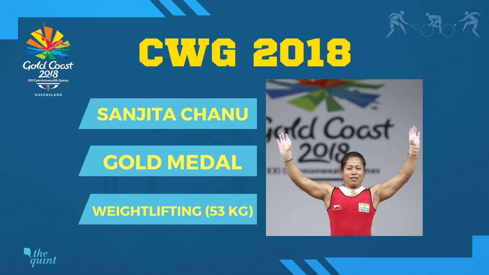 Sanjita Chanu wins the second gold medal in weightlifting for India with a lift of 192 kg. Defending champion Papua New Guinea's Loa Dika Toua came distant second second with a lift of 182 kg. Sanjita during her attempts broke Commonwealth Games record in the snatch category with a lift of 84 kg. Participating in the 53 kg category this time, Sanjita had won gold in Glasgow in 2014 in the 48 kg category.