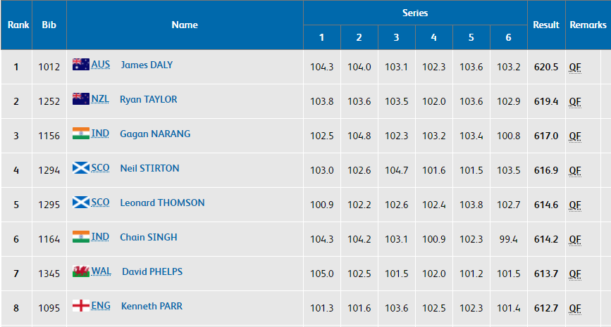 34-year-old Gagan Narang, who has eight Commonwealth Games gold since 2006, had a total of 617.0 points from the six series. His best was in the second series when he tallied 104.8 while the final series of 100.8 brought him down to third place.