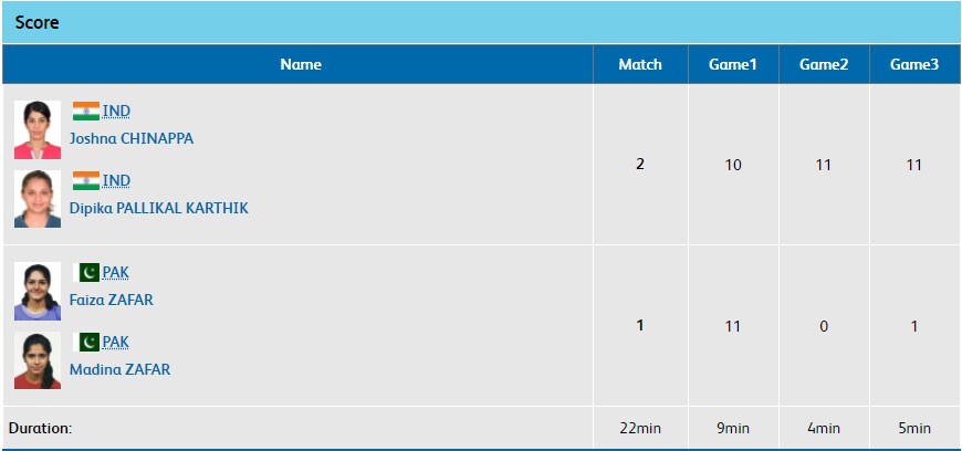 India's squash doubles pair of Joshna Chinappa-Dipika Pallikal have won their opening Pool C match against Pakistan's Faiza Zafar and Madina Zafar. The Indian duo won 10-11, 11-0, 11-1.