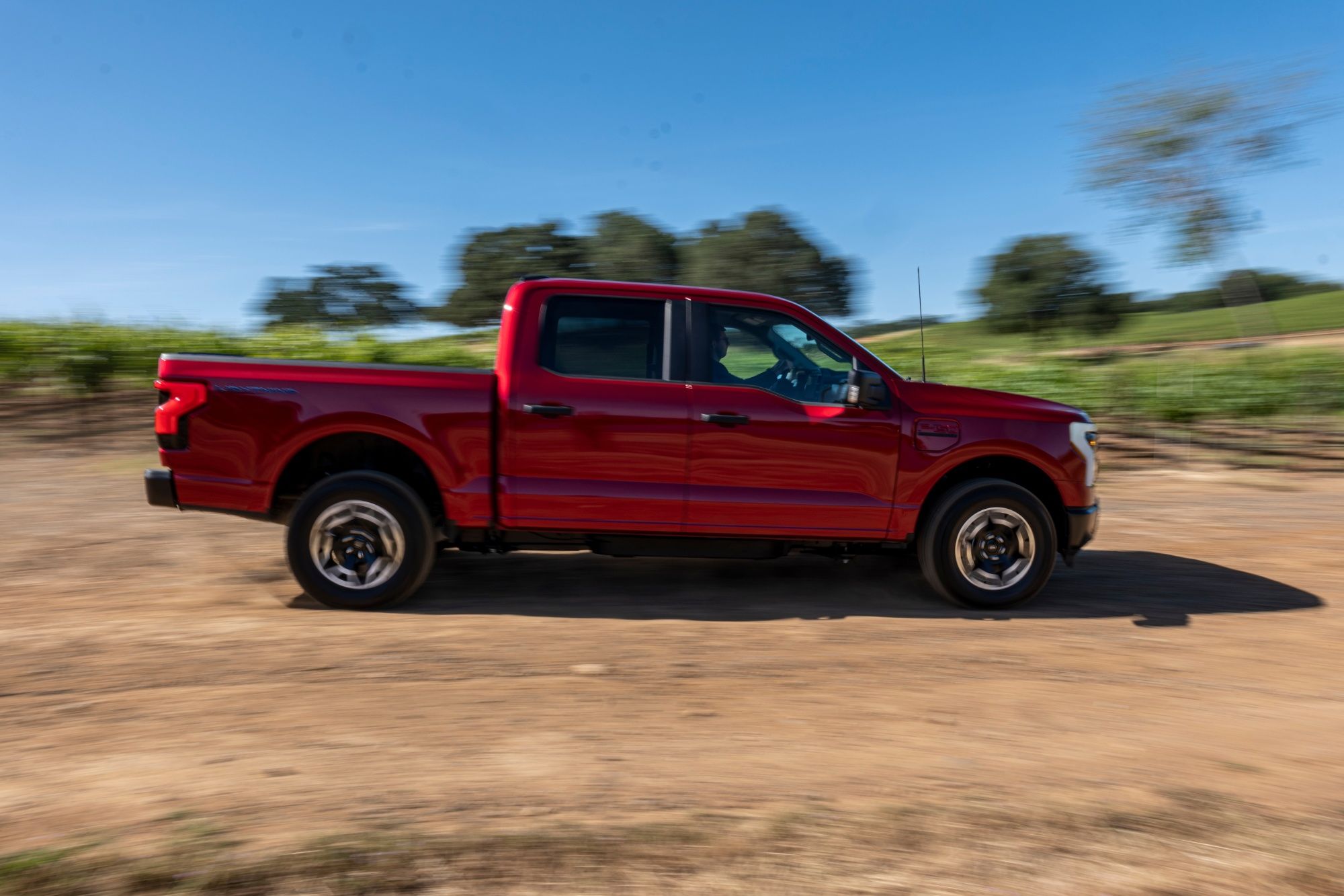 Ford brought more than a dozen trucks to Sonoma for media test drives, and I spent an hour piloting a $77,000 “iced blue silver” Lightning Lariat around the Russian River Valley's narrow winding roads, cocooned in a whisper-quiet cabin. The 6,600-pound pickup handled like a much smaller vehicle, and I can confirm Joe Biden wasn't exaggerating when he said “this sucker's quick” after a lap last year.