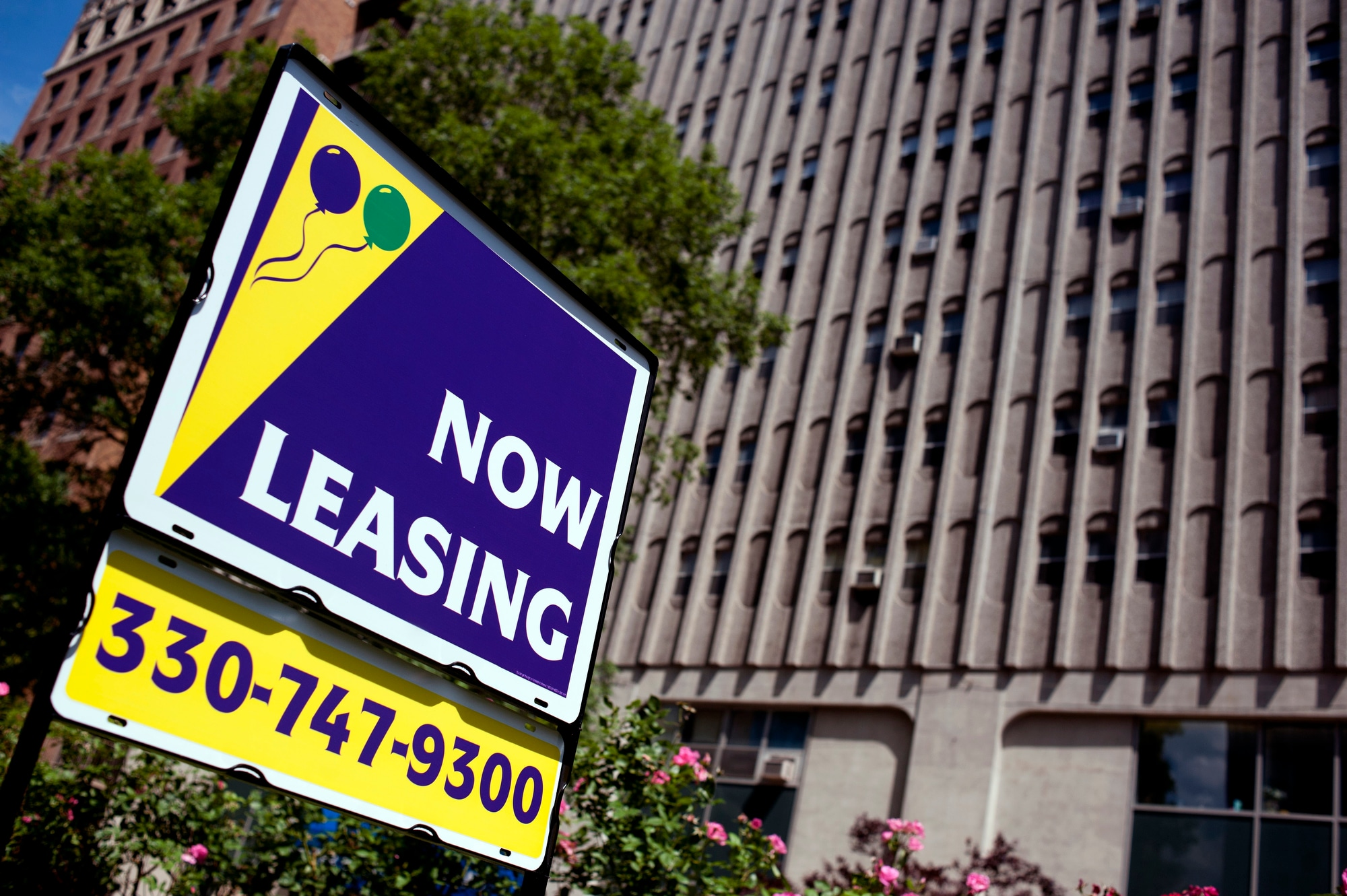 A leasing sign sits in front of an office building. (Photographer: Ty Wright/Bloomberg)