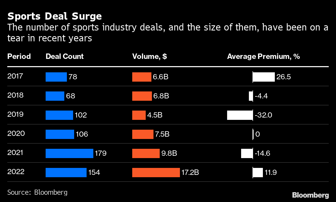 “This deal has to be at a landmark valuation,” said Adam Sommerfeld, sports investment specialist at London-based Certus Capital Partners. “Clearly this is the leading light of football, probably sport overall in terms of M&A at the moment. Everyone who is anyone is going to be looking at this very seriously.”