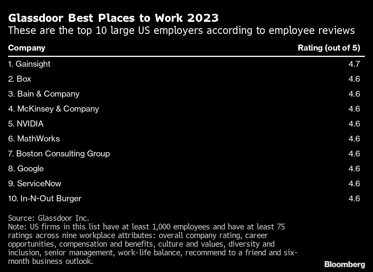 (Bloomberg) -- Glassdoor's list of 100 best places to work in 2023 is dominated by tech companies, but this year two regular winners didn't make the cut: Apple and Meta.