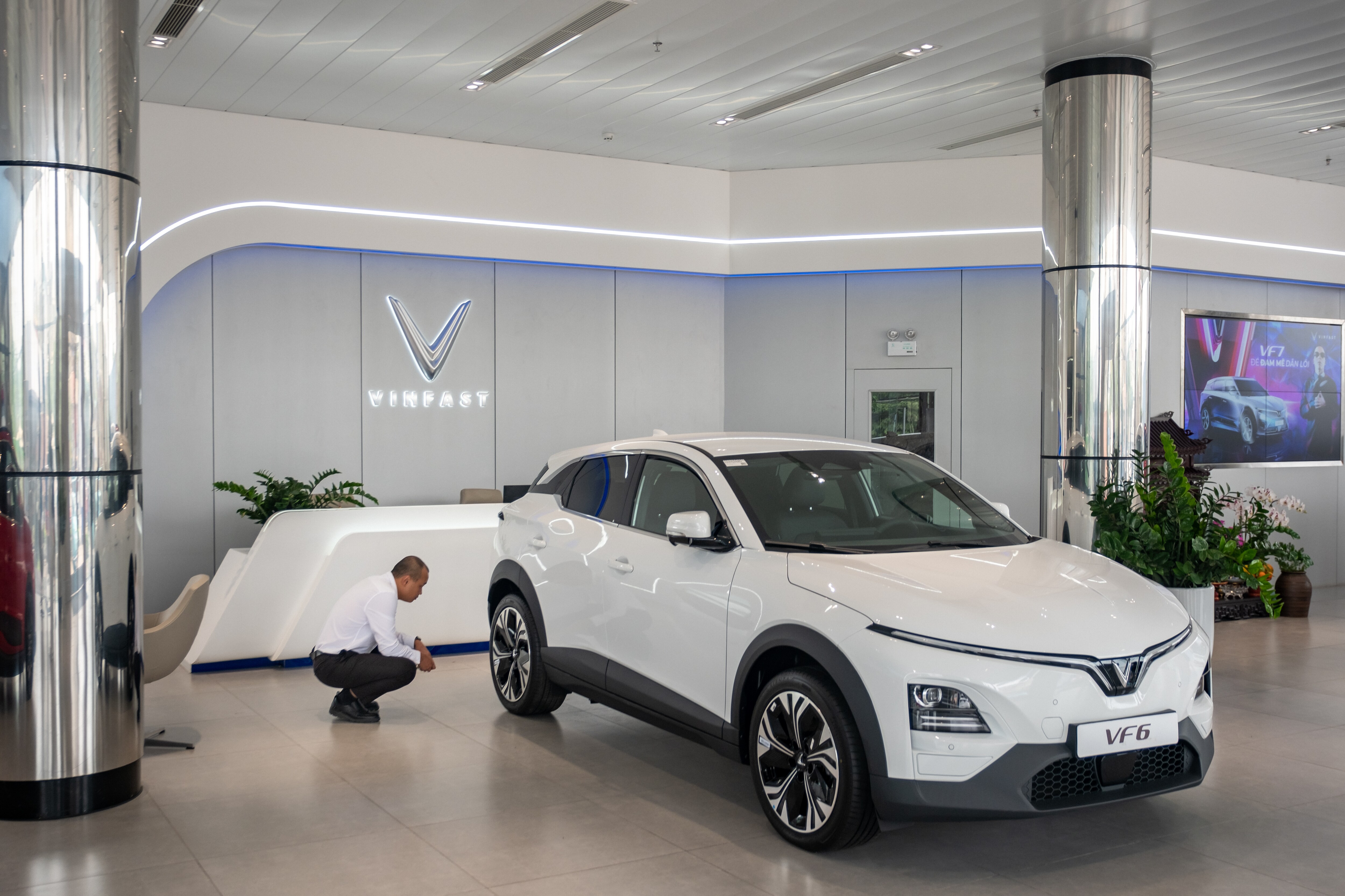 A customer inspects a VinFast VF 6 model at a company's showroom in Hanoi.