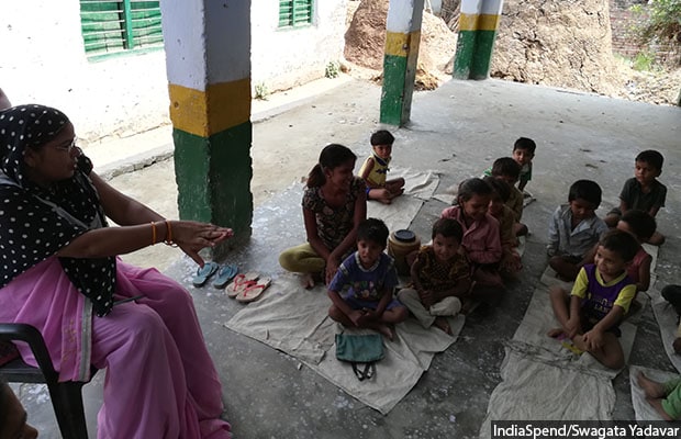 When IndiaSpend visited the anganwadi centre of Gadhiya village in Rajepur block, children sat in the verandah of the primary school where the centre is housed. With no boundary wall, the children sat near heaps of cow-dung and hay. “It is too hot for children to sit inside,” said Indradevi, the anganwadi worker. The centre had no electricity. Inside the classroom allotted to the anganwadi, there was a single broken bench and the floor was uneven and cracked. The school was being renovated, but not the anganwadi.