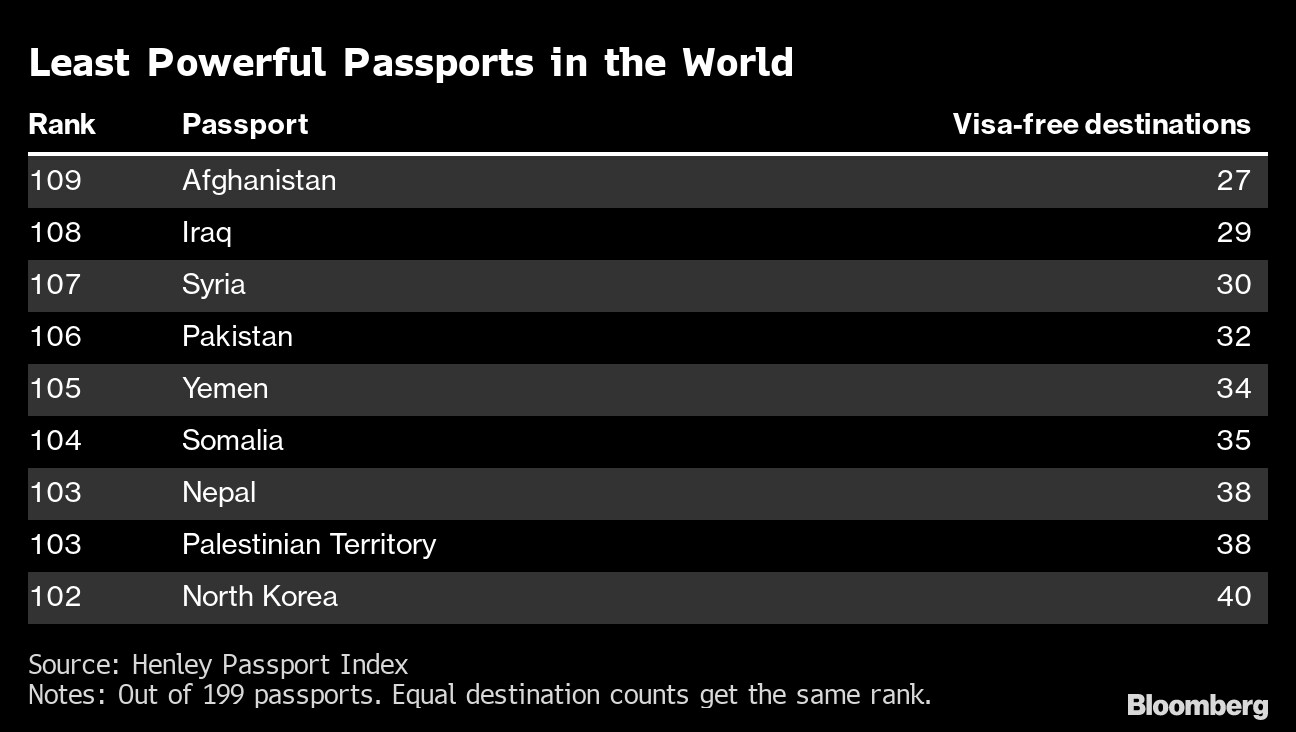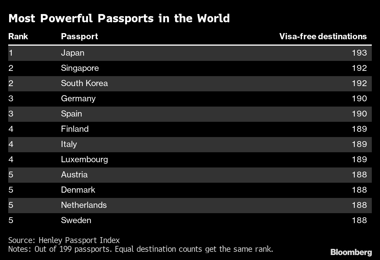 (Bloomberg) -- Japan starts 2023 with the world's most powerful passport, allowing visa-free entry to 193 global destinations, according to the latest Henley Passport Index, which the country tops for the fifth consecutive year.